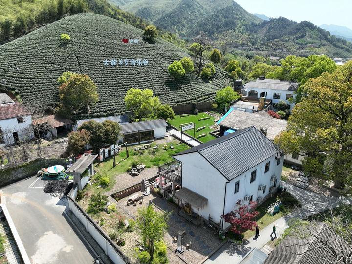 在浙江省安吉縣上墅鄉(xiāng)上墅村,茶山和一個鄉(xiāng)村文旅項目結(jié)合在一起(2024年4月9日攝,無人機照片)。新華社記者 翁忻旸 攝