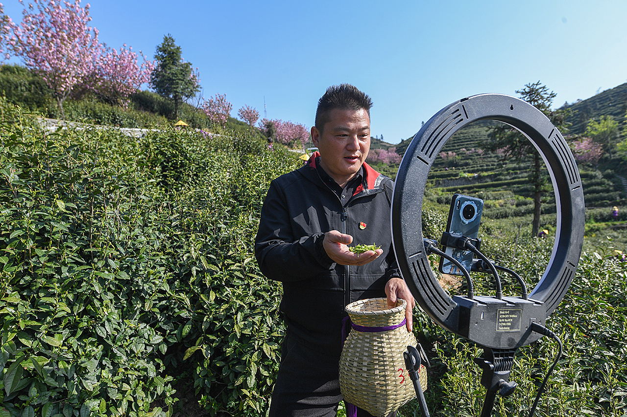 4月8日,在里山鎮(zhèn)安頂山上的高山云霧茶地,黨員志愿者在錄制高山茶推介視頻,用于網(wǎng)上銷售